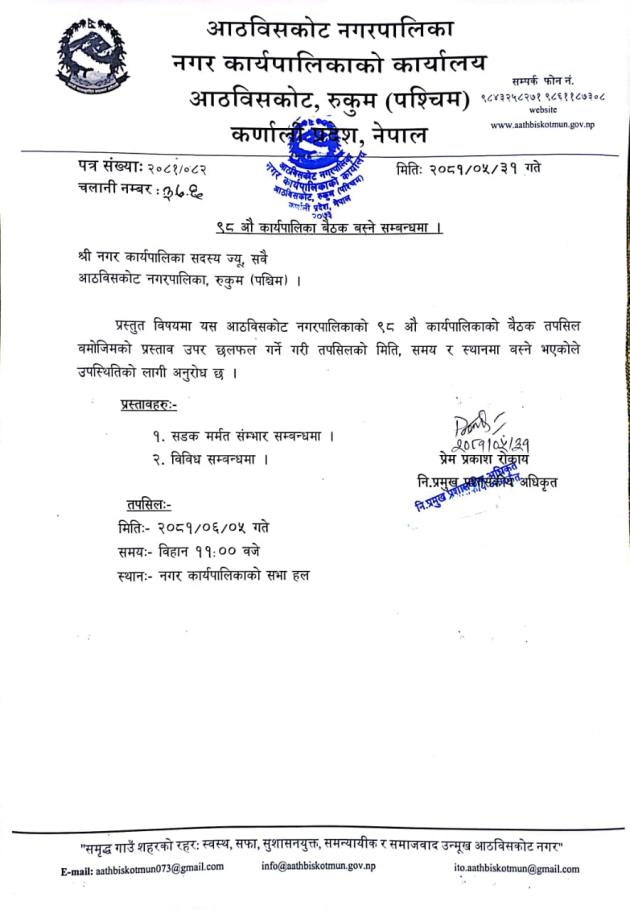 ९८ औ कार्यपालिका बैठक बस्ने सम्बन्धमा ।